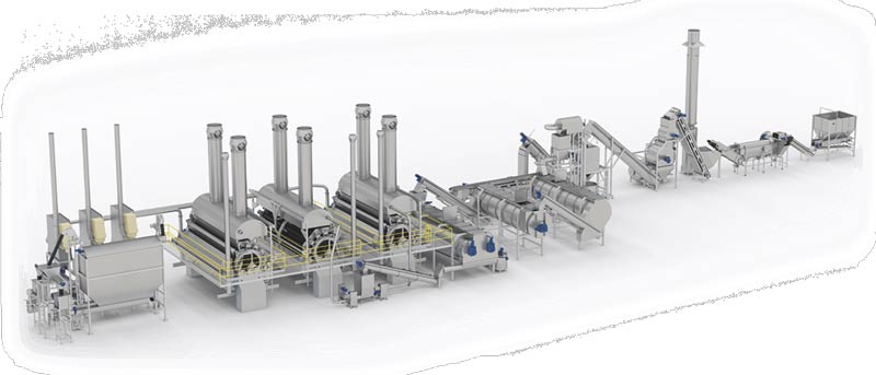 De fritesgeschikte aardappelen komen onder uit het zoutbad en worden door een wasser verder getransporteerd naar de stoomschiller. De aardappelen met een laag soortelijk gewicht zijn lichter waardoor ze gaan drijven en uit de stroom worden verwijderd. Door hoge druk op de aardappelen te zetten, ontdoen we de aardappelen van hun schil. Door van hoge druk naar normale druk te gaan, laat de schil vanzelf los (expansie). In de borstelmachine borstelen we de schil van de aardappelen. Vervolgens worden ze over een aantal rollen getransporteerd waarbij door de loofscheider eventueel achtergebleven loof wordt afgevoerd.
