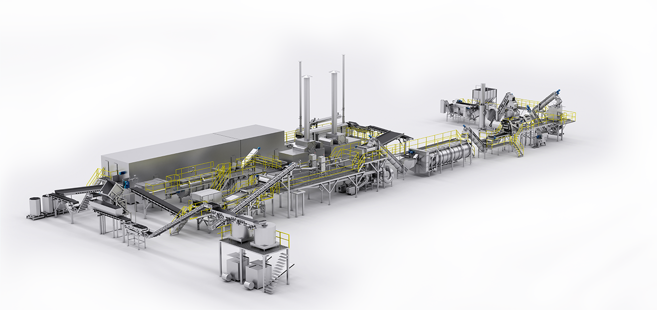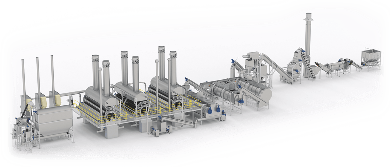 De fritesgeschikte aardappelen komen onder uit het zoutbad en worden door een wasser verder getransporteerd naar de stoomschiller. De aardappelen met een laag soortelijk gewicht zijn lichter waardoor ze gaan drijven en uit de stroom worden verwijderd. Door hoge druk op de aardappelen te zetten, ontdoen we de aardappelen van hun schil. Door van hoge druk naar normale druk te gaan, laat de schil vanzelf los (expansie). In de borstelmachine borstelen we de schil van de aardappelen. Vervolgens worden ze over een aantal rollen getransporteerd waarbij door de loofscheider eventueel achtergebleven loof wordt afgevoerd.